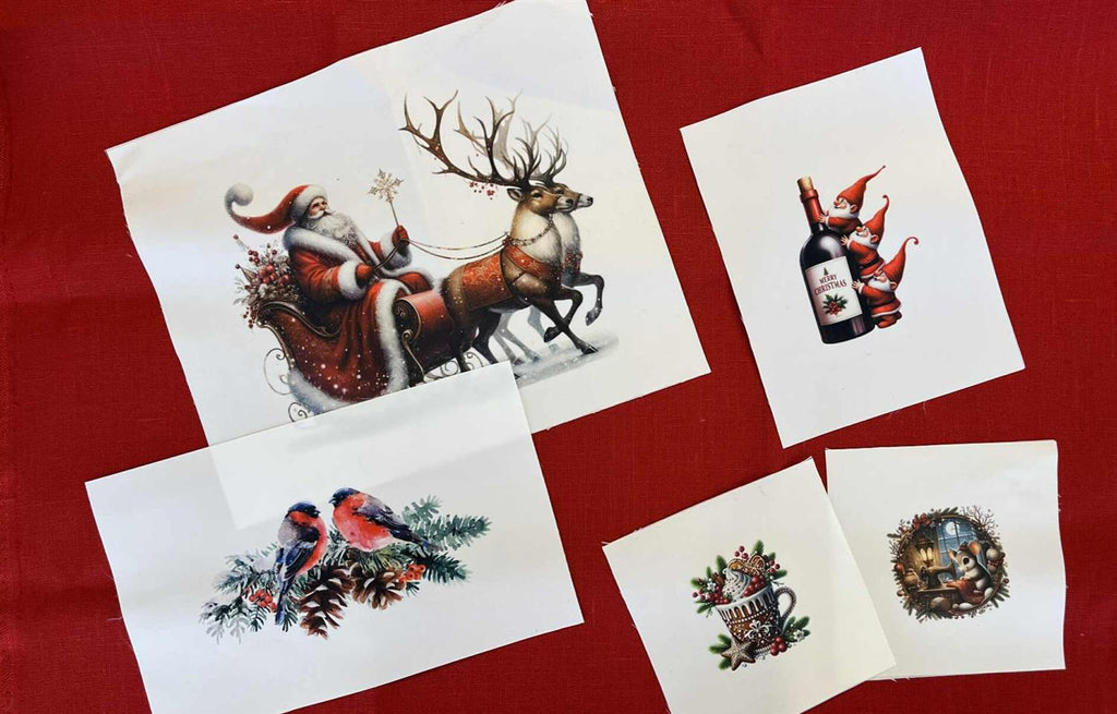 5 bilder i varierande størrelse frå nissen i slede som er Letter size (nesten A4) til koppen som er ca 8x8cm i polyesterstoff