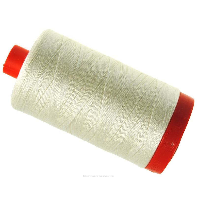 Aurifil’s 50wt/2ply thread is our most versatile and most popular Cotton thread. It is available in all 270 of our Cotton colors, and is wound on our iconic orange spool. The 50wt is strong and thin, and results in remarkably flat and crisp seams. While it is wonderful for piecing, subtle quilting & topstitching, and English Paper Piecing it also works incredibly well for Needle Turn Applique, Bobbin and Machine Lace, Machine Applique (Straight Stitch, ZigZag, Blind Hem and Blanket Stitch,) Machine Embroidery, Dense Machine Quilting, Subtle Machine and Longarm Quilting, Basting, Whole Cloth and Micro Quilting, and Dense Background Designs.