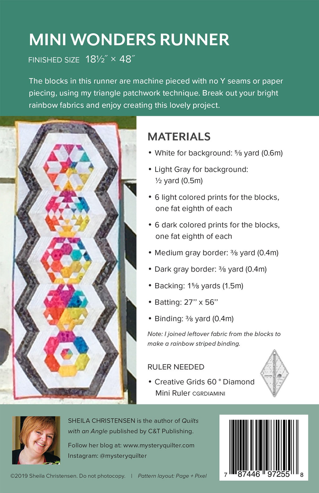 The blocks in this runner may look like they are hand pieced, but they can be sewn on the machine with no Y seams or paper piecing, using my triangle patchwork technique. Break out your bright rainbow fabrics and enjoy creating this lovely project. Finished size 18 1/2" x 48"